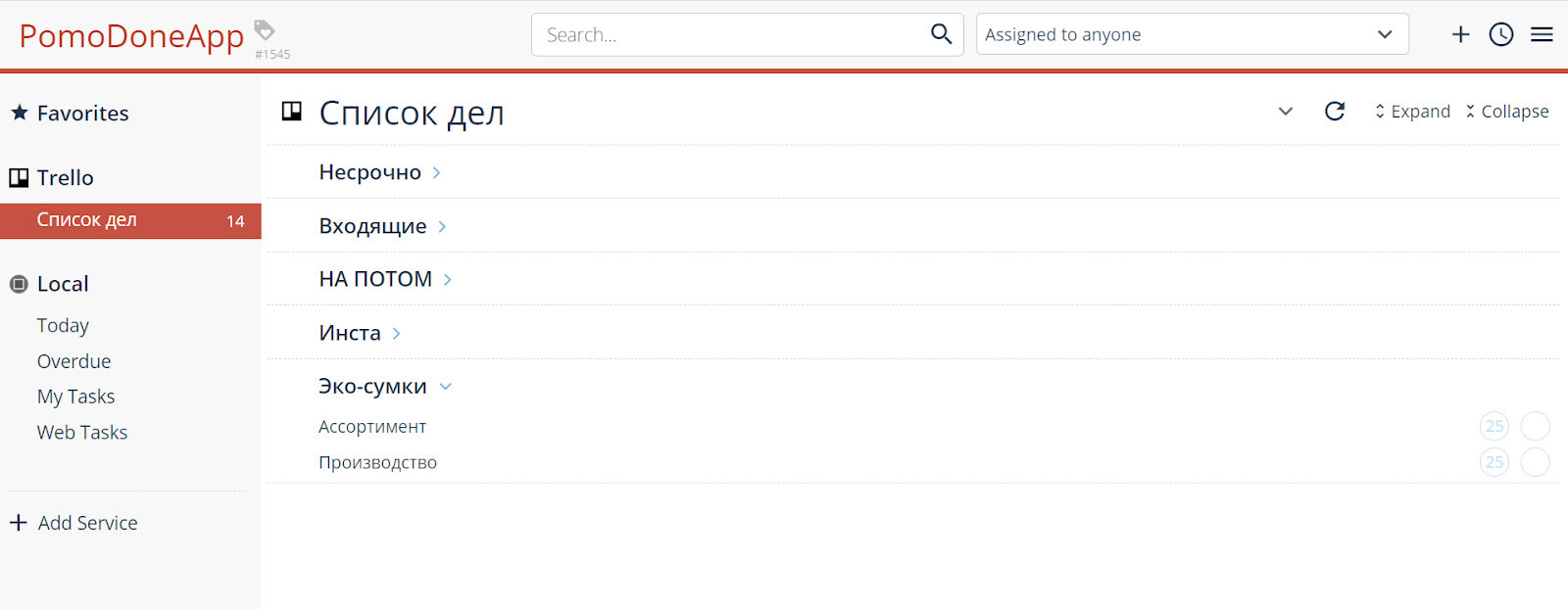 Позиционируется как приложение для систем управления проектами и задачами. PomoDone подключается к Trello, Evernote, Todoist, Asana, Slack и другим таск-менеджерам, после чего в их интерфейсе появляется кнопка таймера.
