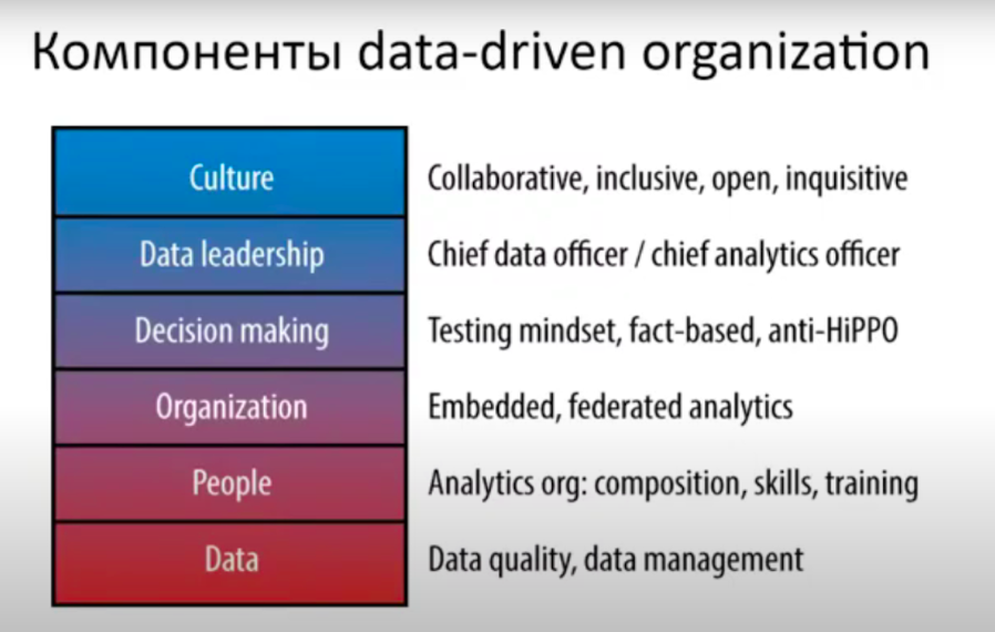 Data Driven-культура. Под культурой подразумевается принятие новых правил всеми сотрудниками компании, когда в каждом отделе сформировано понимание, как и зачем работать с данными, а большинство сотрудников умеет работать с данными и правильно их интерпретировать.