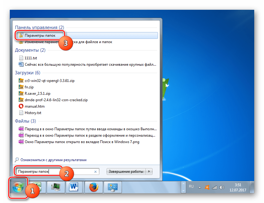 Щелкните «Пуск». В области «Найти программы и файлы» введите: Сразу же после введения в поисковой выдаче в группе «Панель управления» автоматически отобразится результат «Параметры папок». Щелкните по нему.
