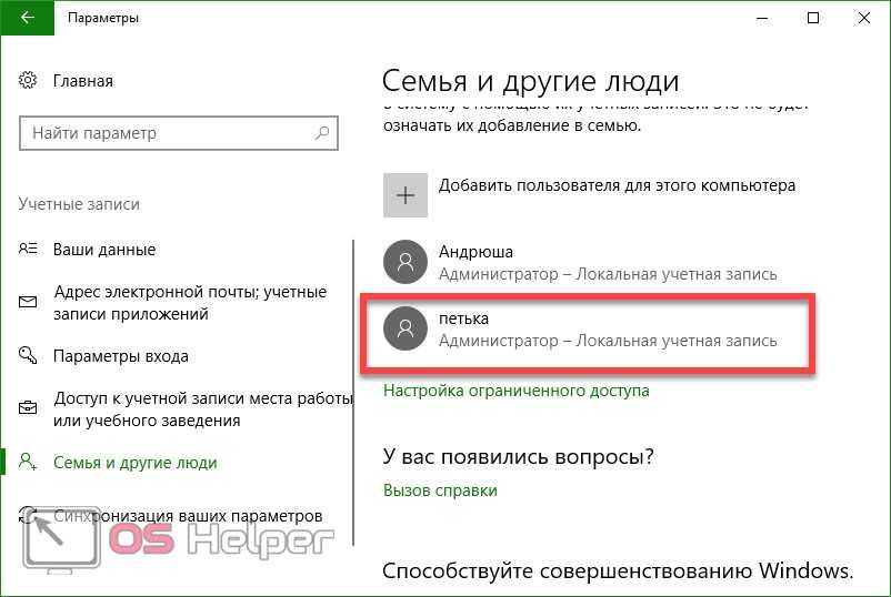Но если вы хотите сделать его администратором компьютера, вам нужно в разделе «Семья и другие люди» нажать на имя нового пользователя :