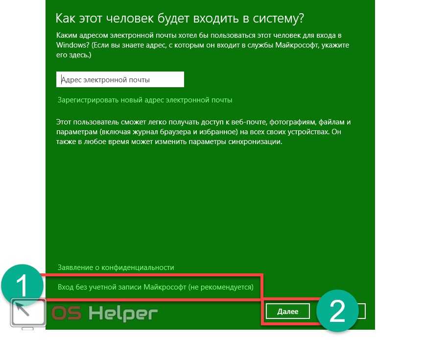 - По умолчанию Microsoft хочет, чтобы вы добавили нового пользователя через учетную запись Microsoft. Если для вас это не проблема, просто введите его e-mail или номер телефона, использовавшийся при регистрации учетной записи, и нажмите Далее. Новый пользователь будет добавлен автоматически, вся его информация будет взята из учетной записи Microsoft.