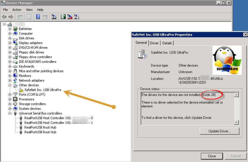 И так, давайте я для начала опишу инфраструктуру. Есть виртуальная машина на Vmware ESXI 6.5, на которой установлена операционная система Windows Server 2008 R2, вы спросите, почему не 2016, все просто, старый софт не будет работать на ней. На данном сервере установлен сервер IP телефонии, для его лицензирования используется USB ключ-защиты SafeNEt USB SuperPRO, который через технологию USB over IP, прокинут внутрь виртуальной машины. Были сетевые работы и работы по установке обновлений безопасности в системе, после чего SafeNEt USB SuperPRO стал определяться с предупреждением в утилите Remote HUB USB Viewer и в диспетчере устройств, имел статус что у него не установлен драйвер (код 28) (The drivers for this device are not installed (Code 28)).