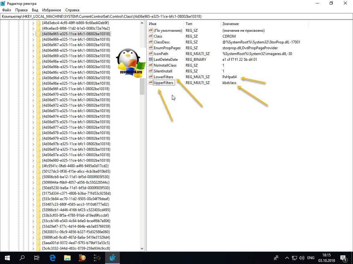 - Выделить пункт «UpperFilters», вызвать меню (правой кнопкой) и выбрать «Удалить». То же самое проделать с параметром LowerFilters (если имеется).