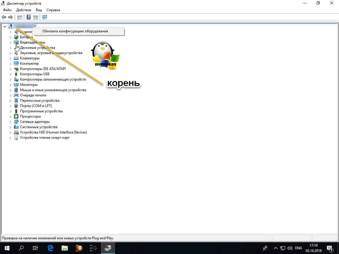 Теперь нужно заново обновить конфигурацию вашего оборудования, чтобы Windows переопределила все устройства. которые есть у нее и заново установила на нужные из них, пакеты рабочих драйверов. Для этого перейдите в корень всех устройств, щелкните по нему правым кликом и выберите пункт «Обновить конфигурацию оборудования».