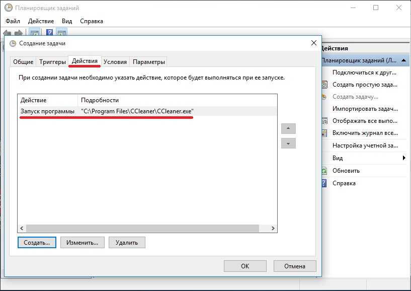 Во вкладке «Действия» выбираем нужную программу и задаем параметр «Запуск программы».