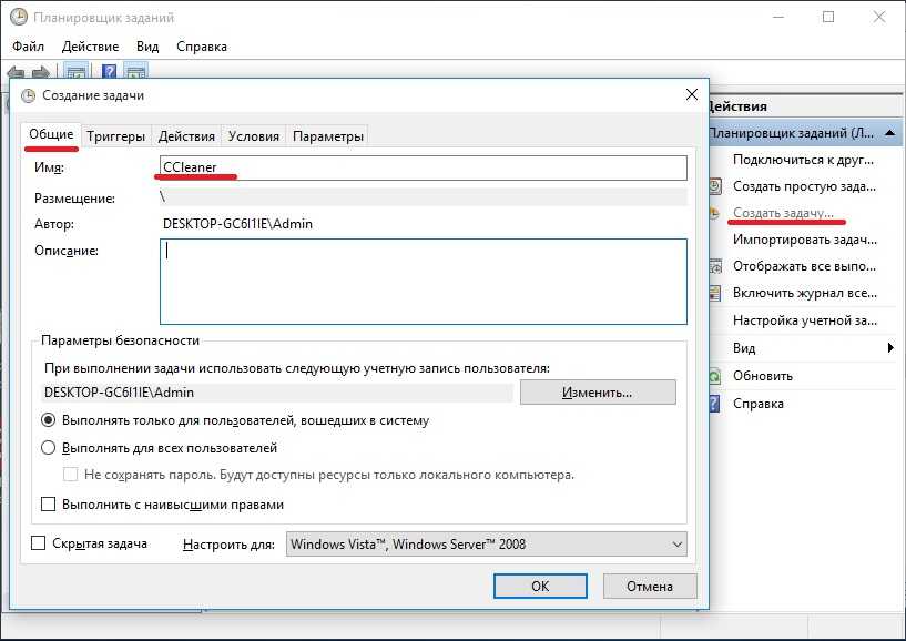 В открывшемся справа контекстном меню выбираем пункт «Создать задачу». Во вкладке «Общие» задаем нужное имя задачи.
