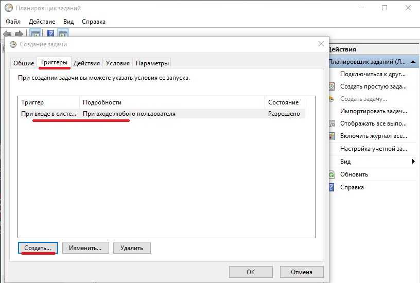 Во вкладке «Триггеры» создаем триггер с параметром «При входе в систему» (напротив «Начать задачу:» из списка команд выбираем «При входе в систему»).