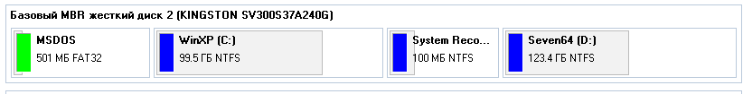 На диске получится снова 4-ре первичных раздела: а) MS DOS + Grub4DOS — на 500Мб с буквой Х — активный б) WinXP на 100 Гб — с буквой — раздел с системой Windows XP — не активный в) System Recovery на 100 или 200 Мб- без буквы — от Windows 7 — не активный г) Win7 на 150Гб — с буквой — раздел собственно с ядром Windows 7 — не активный