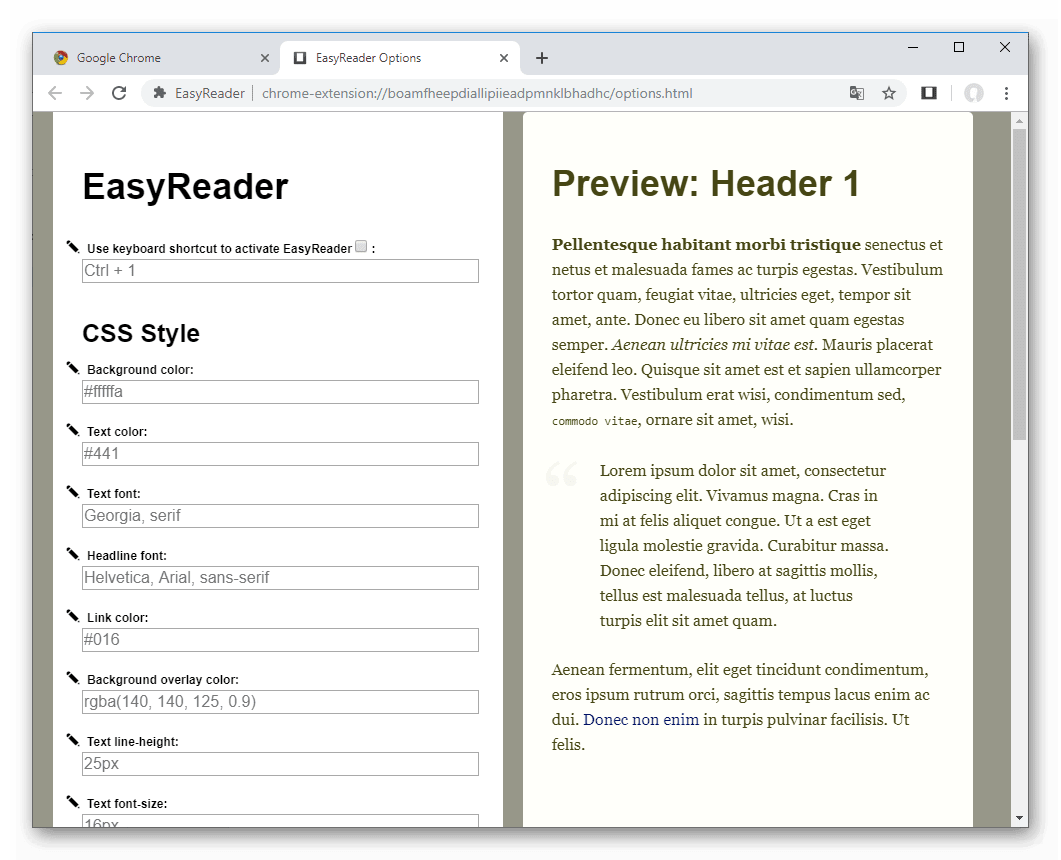 В отличие от встроенной опции Google Chrome данное расширение для чтения в браузере позволяет не только убрать на странице лишние элементы, но и по желанию менять тему оформления, шрифты.