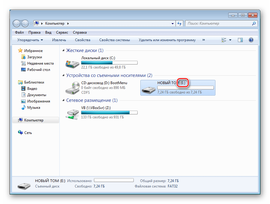 - Вставьте накопитель в USB-разъем, дождитесь, пока он определится оснасткой «Компьютер», и запомните присвоенную букву.