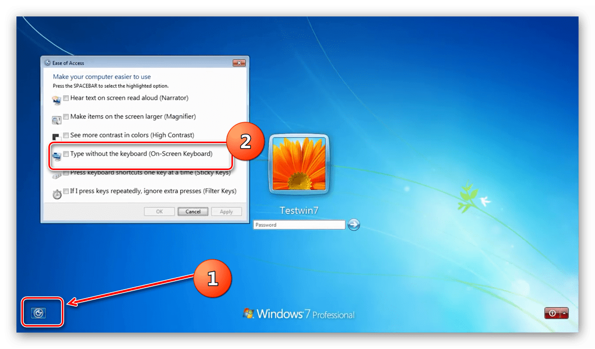 Покиньте установщик Windows, выключите компьютер и отключите загрузочный носитель. Запустите машину и дождитесь появления экрана логина. Щёлкните по кнопке «Специальные возможности» — она расположена внизу слева – выберите вариант «Ввод текста без клавиатуры» и нажмите «Применить» и «ОК».