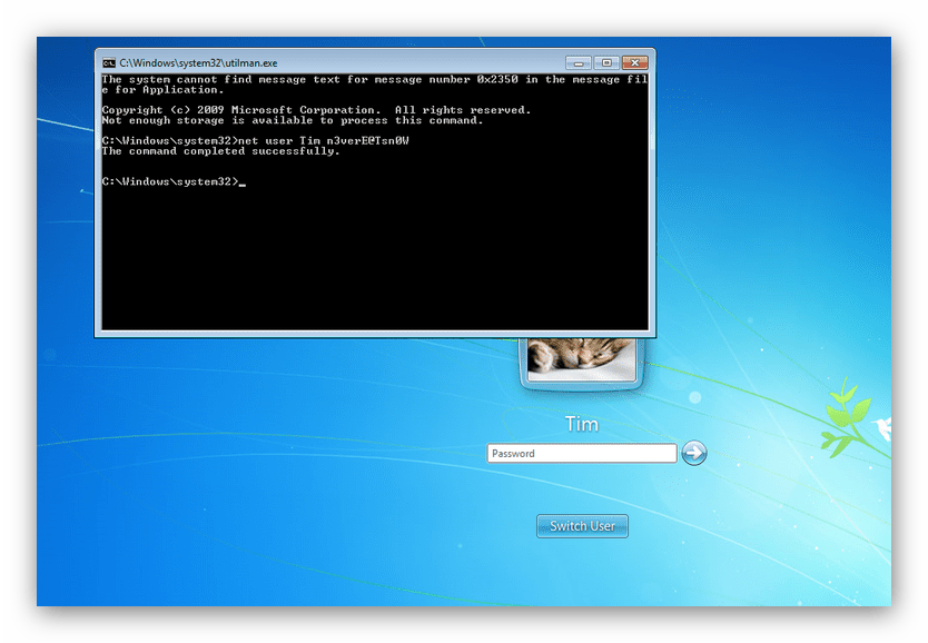 После чего закрываем командную строку, попадаем на экран авторизации и вводим новый пароль.