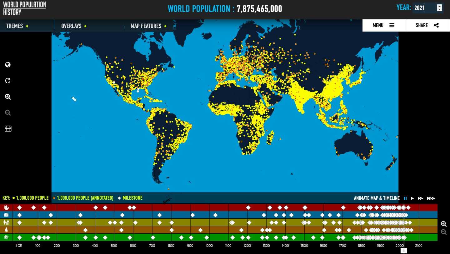 А чтобы лучше ориентироваться в окружающей обстановке в тот или иной отрезок времени, можно посмотреть, какие тогда происходили значимые для социальной истории события (например, эпидемии или технические изобретения). Кроме того, можно посмотреть, как вместе с числом людей изменяется количество выбросов углекислого газа, распространяется урбанизация и увеличивается продолжительность жизни с разной скоростью в разных регионах.