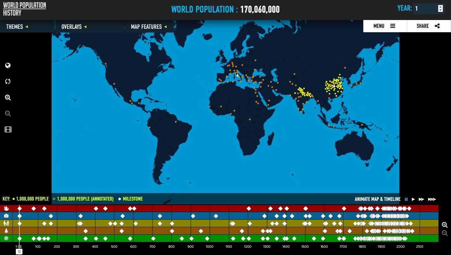 Осознать общие тенденции развития человечества можно с помощью еще одного проекта. На карте, охватывающей период с 1 г. н. э. до 2050 года, один кружок соответствует одному миллиону человек, которые проживают в данном регионе.