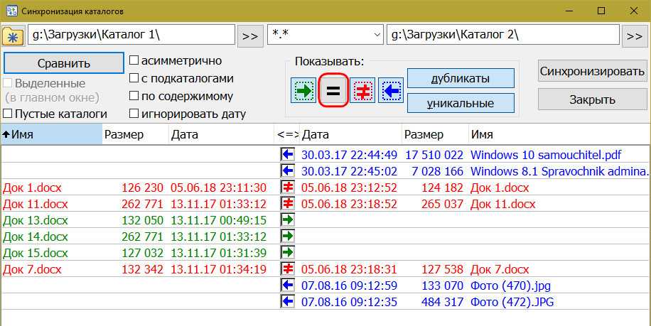 • Чёрным текстом будут помечены идентичные файлы и между папками будет отображаться значок «=». Эти данные не синхронизируются. • Зелёным будут значиться файлы, которые есть в папке на панели слева, но их нет на панели справа. Стрелка вправо означает курс создания их копий на панели справа. • Синим цветом будут обозначены файлы папки на панели справа, которых нет в папке на панели слева. Их значок – стрелка влево, и это, соответственно, курс копирования на левую панель. • Разные редакции данных с одним и тем же названием будут присутствовать на обоих панелях, но окрасятся в цвет направления панели с более свежими редакциями. • По всем файлам увидим их названия, вес и дату создания или последнего редактирования.