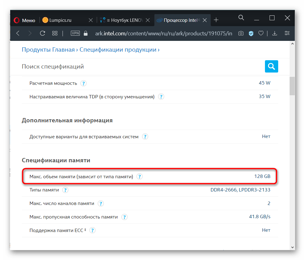 Впишите это название в поисковик и поищите нужные сведения на официальном сайте производителя. Отметим, что AMD по какой-то причине не указывает максимальный объем RAM, поэтому искать информацию придется на сторонних ресурсах. У Intel, напротив, без труда можно отыскать эти данные.