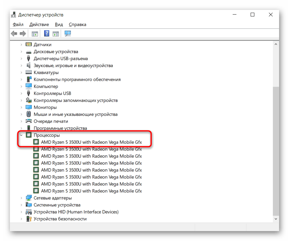 Разверните вкладку «Процессоры» — там будет написана модель CPU.