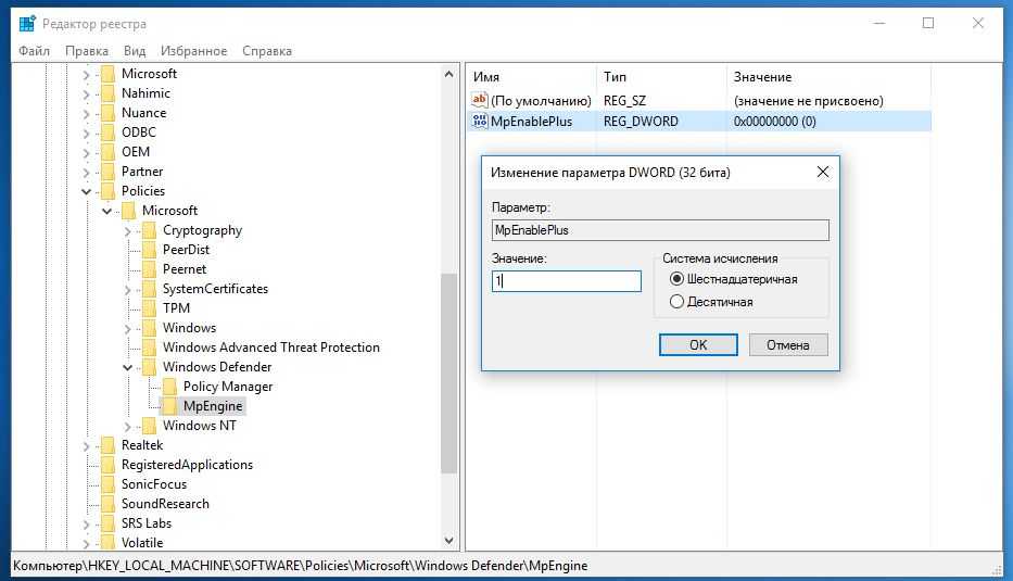 Теперь правой кнопкой мыши щелкните по правому полю и выберите «Создать | Раздел». Назовите его «MpEngine». Создайте для «MpEngine» «Параметр DWORD (32 бита)» с названием «MpEnablePus». Теперь дважды щелкните по нему и введите значение «1». Перезапустите компьютер, чтобы активировать блокировщик рекламного ПО.