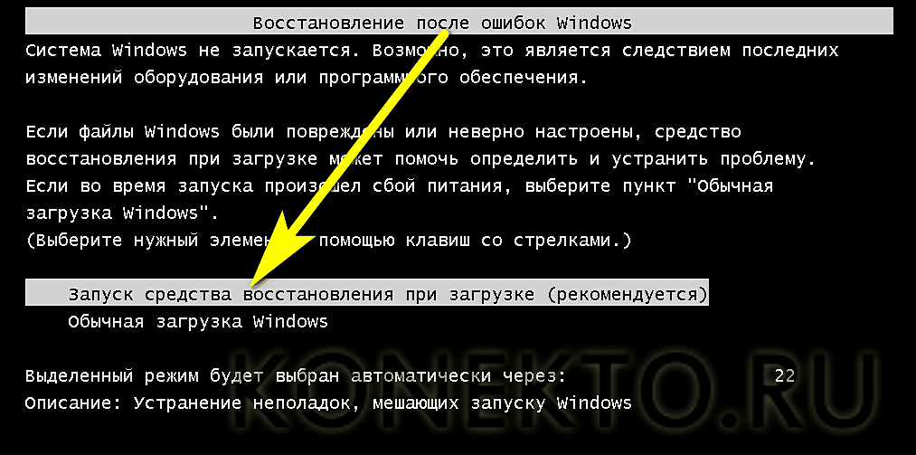 Одна из возможных причин — поврежден менеджер загрузки. В этом случае вы можете просто исправить это с помощью восстановления при загрузке.