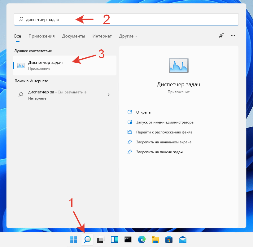Вы можете запустить Диспетчер задач в Windows 11, как и любое другое приложение по умолчанию или сторонних разработчиков, с помощью Поиска Windows. Нажмите кнопку поиска на панели задач (можно также использовать клавиши на клавиатуре Windows + S) или откройте меню Пуск и введите Диспетчер задач. Windows 11 покажет вам Диспетчер задач в результатах поиска.