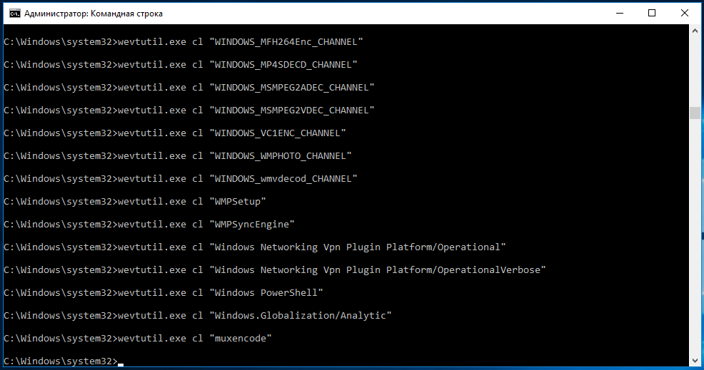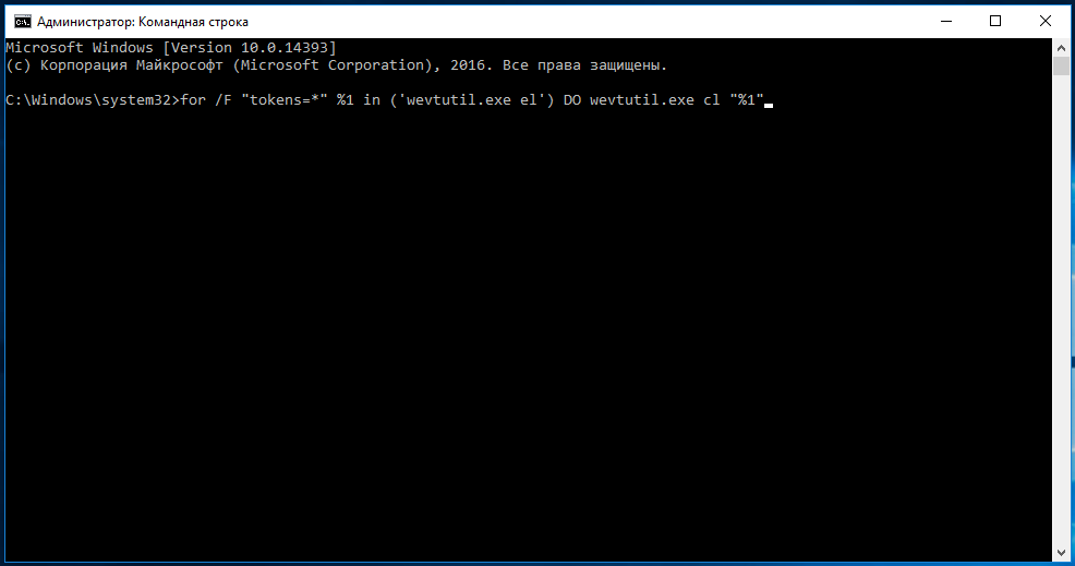В консоль вставляем следующий код: for /F «tokens=*» %1 in (‘wevtutil.exe el’) DO wevtutil.exe cl «%1»