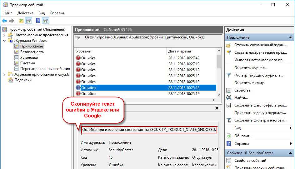 В утилите “Просмотр событий” предусмотрена возможность поиска и фильтрации событий:
