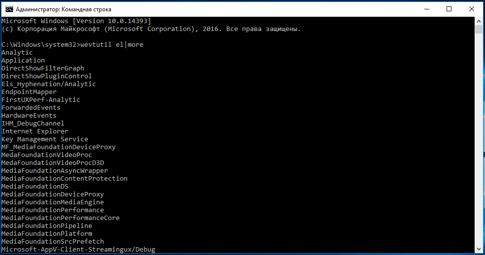 Чтобы вывести список зарегистрированных в системе журналов событий, выполните команду: