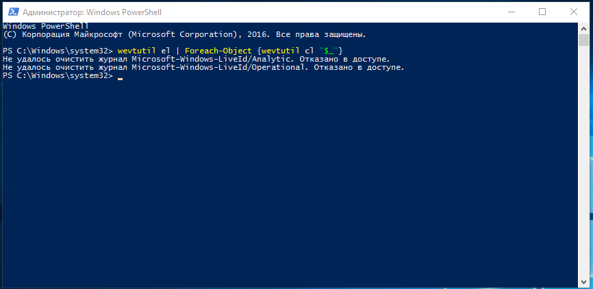 Запускаем PowerShell от имени администратора и вводим следующую команду: wevtutil el | Foreach-Object {wevtutil cl «$_»}