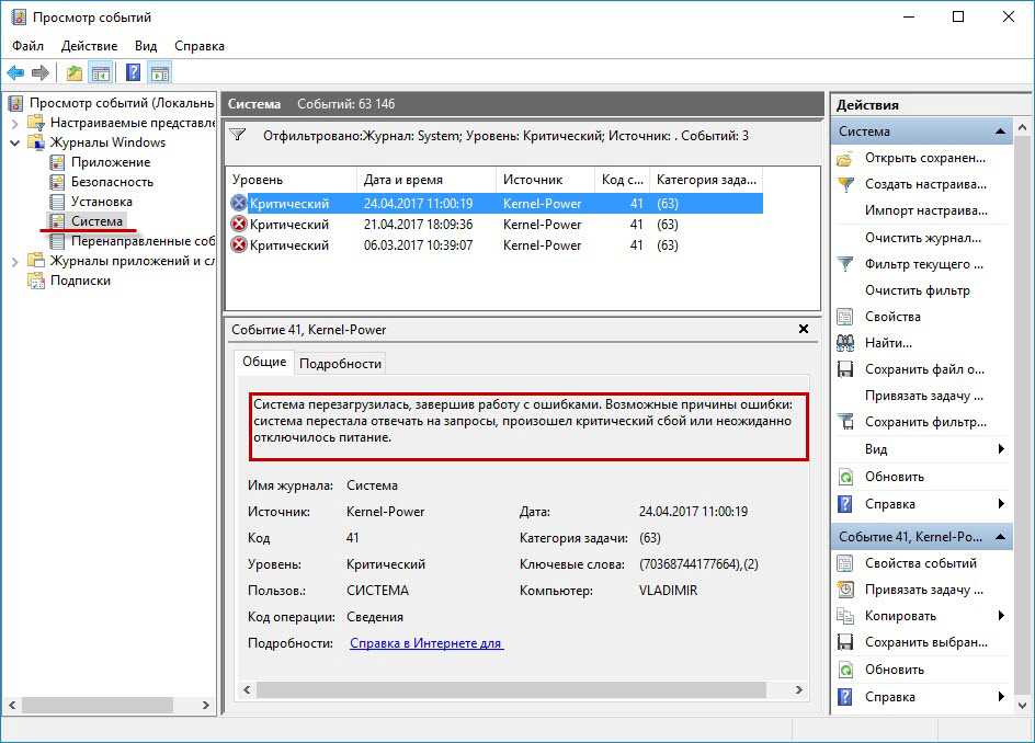 Была у меня и другая ситуация: сижу, работаю за компьютером – вдруг ни с того ни с сего он резко выключается. Тогда я включаю его снова – захожу в журнал Windows в подраздел “Система” и читаю описание критического события, которое только что произошло. А там написано: “Система перезагрузилась, завершив работу с ошибками. Возможные причины ошибки: система перестала отвечать на запросы, произошел критический сбой или неожиданно отключилось питание”.