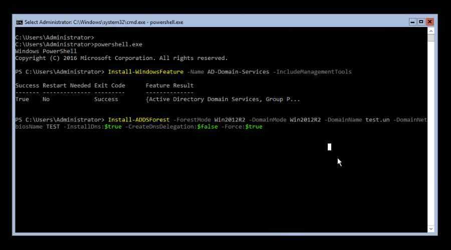 Install-ADDSForest -ForestMode Win2012R2 -DomainMode Win2012R2 -DomainName test.un \