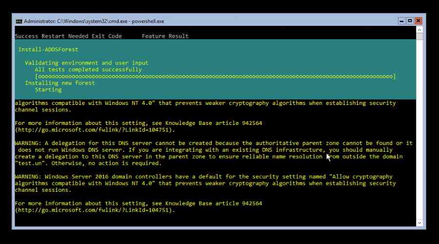 -DomainNetbiosName TEST -InstallDns:$true -CreateDnsDelegation:$false -Force:$true