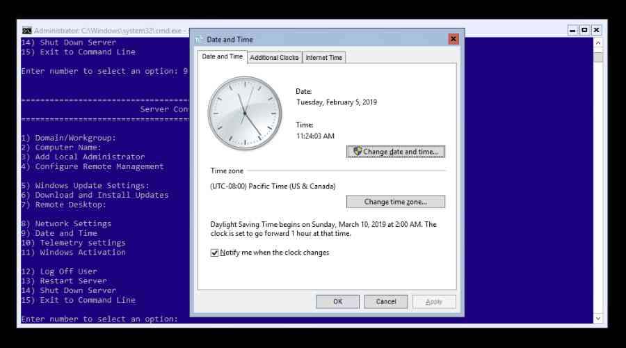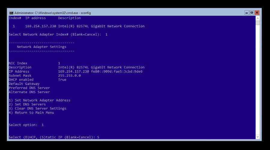 Первым делом произведем предварительные настройки системы (сеть, имя компьютера, дата и время). Для этого воспользуемся утилитой sconfig