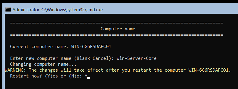 Нам сообщается, что новое имя будет применено после перезагрузки компьютера. Чтобы перезагрузить компьютер прямо сейчас, введите «Y» и нажмите Enter.