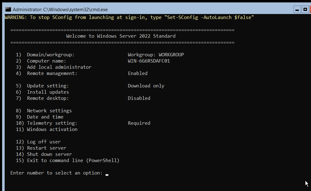 При включении сервера вновь запустится SConfig, если вы хотите отключить автозагрузку SConfig при входе в систему, в меню выберите опцию 15) Exit to command line (PowerShell) чтобы выйти в командную строку (PowerShell) и в командной строке выполните команду: