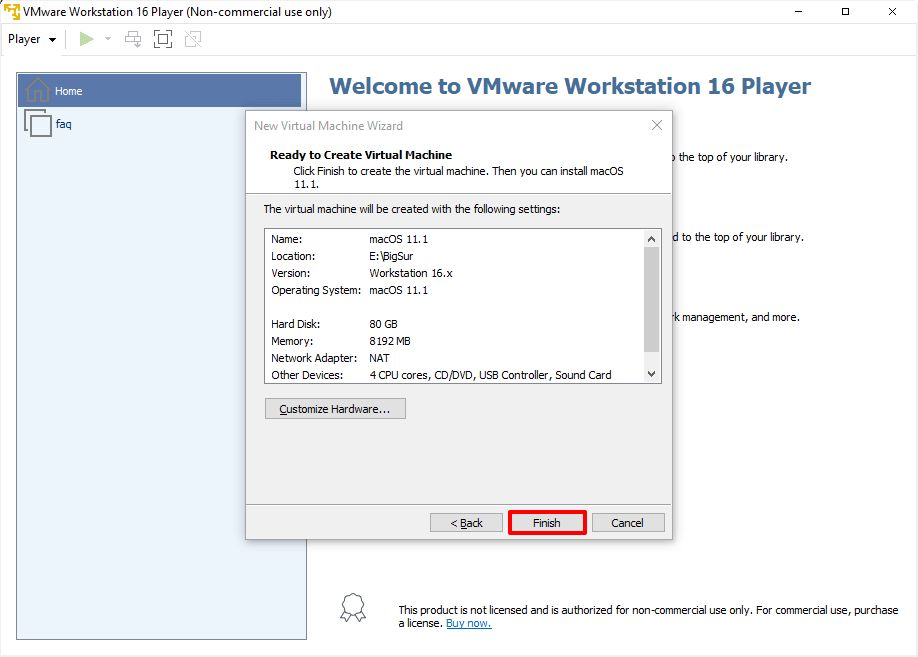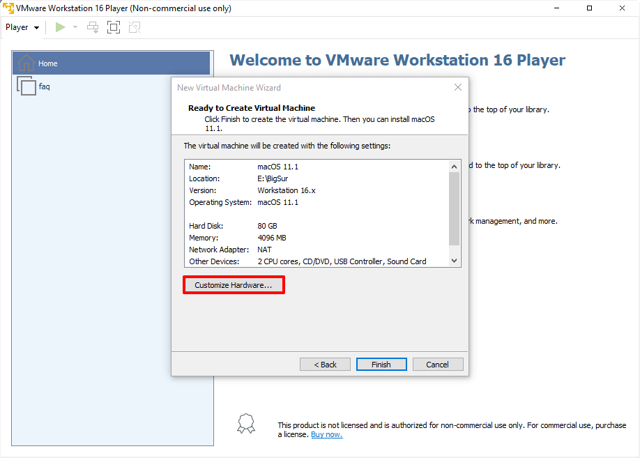 Step #5. You are in the last step running a Virtual Machine, you can see here the default settings of VMware, but I want you to customise them. Change it’s to 2GB, give it two processors, also check 3d graphic. When you are done, click Finish.