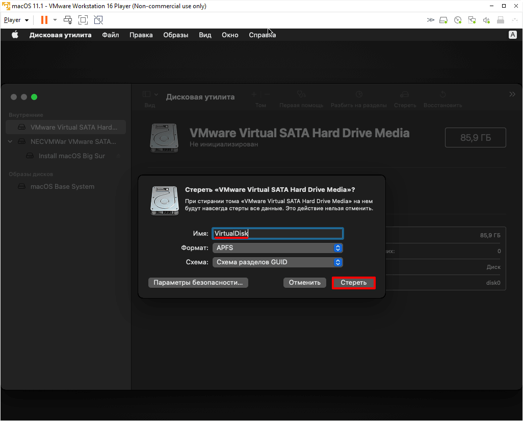 В этой статье мы расскажем, как проходит установка macOS на компьютер через VMware Workstation Player. Для работы вам понадобится готовый ISO-образ операционной системы. На VMware mac OS устанавливается в 4 этапа: