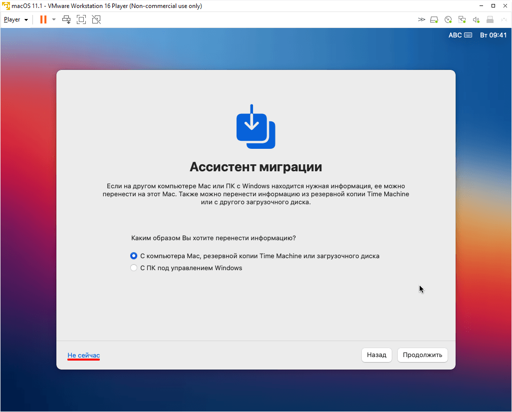 На этапе «Ассистент миграции» в левом нижнем углу нажмите Не сейчас: