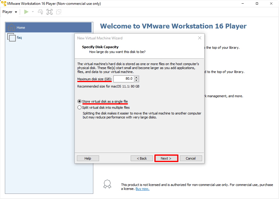 Step #4. For this step, you need to verify the space disk size for virtual Machine. Also, select to store the virtual disk in a single disk file.
