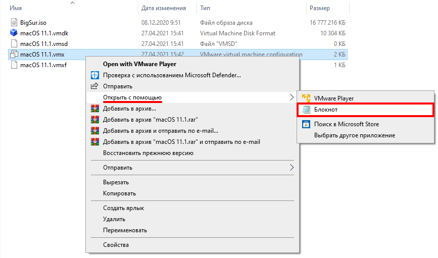 Перед запуском гостевой ОС нужно внести изменения в файл с расширением .VMX.