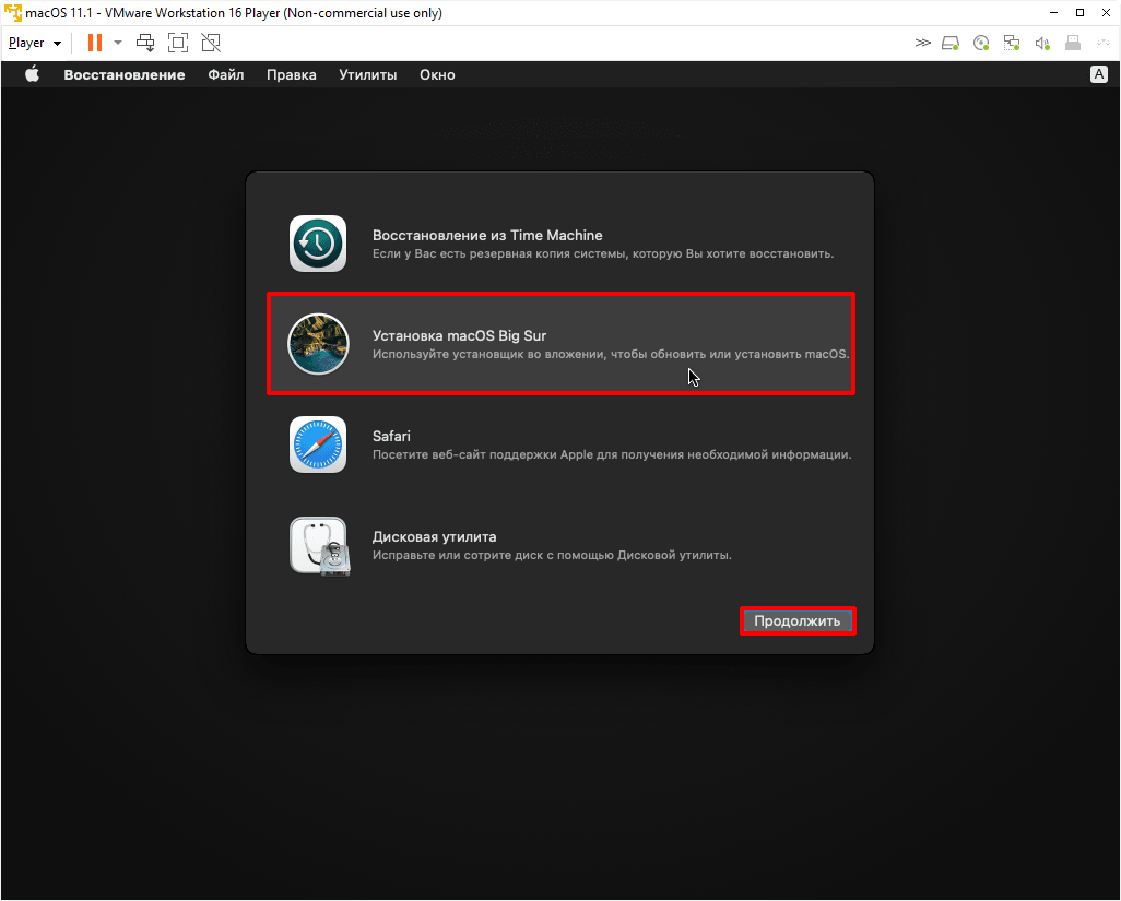 Выберите Установка macOS Big Sur и кликните Продолжить: