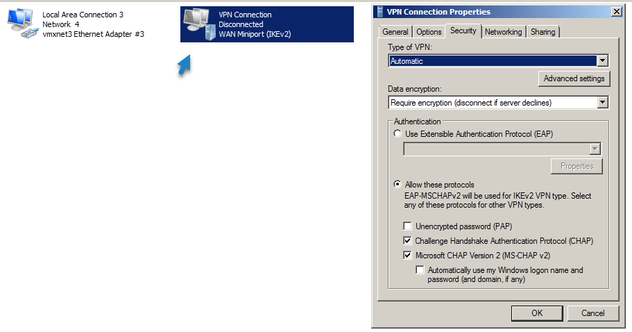 Тип подключения. Выбор протокола подключения важен, и в конечном итоге пройдет ручной тип проверки подлинности, который будет использоваться. Дополнительные сведения о доступных протоколах туннелирования см. в разделе типы VPN-подключений.