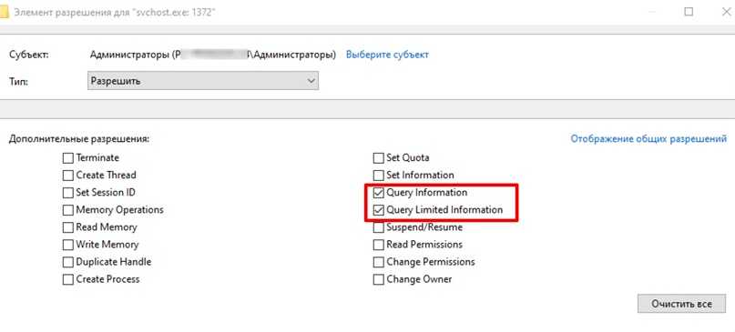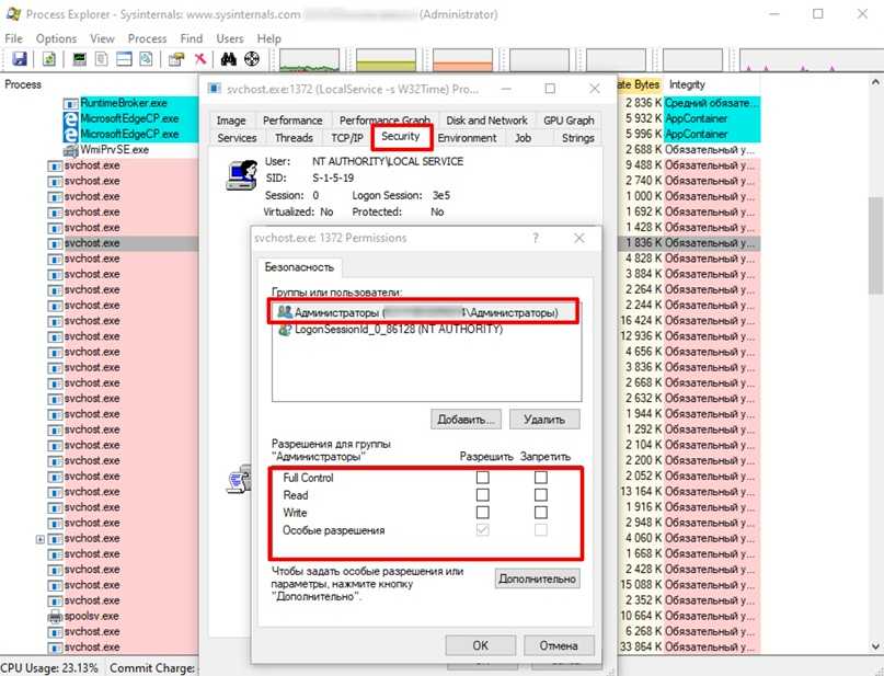 В примере выше к этому процессу имеют доступ только локальные администраторы. При этом читать и писать в процесс они не могут, но имеют “Особые разрешения“.