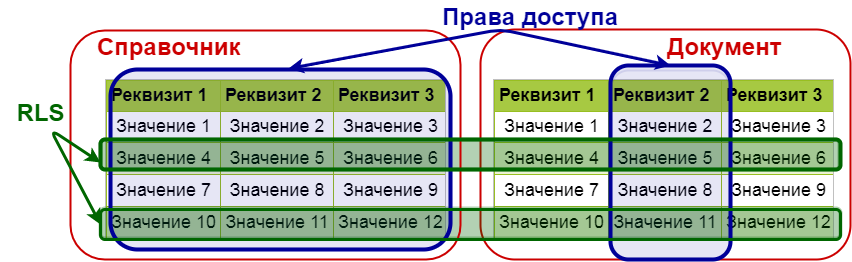 Для настройки такого разрешения есть дополнительный механизм RLS (Record Level Security). Как и следует из названия, этот механизм контроля доступа на уровне конкретных записей таблиц. Если права доступа дают доступ к таблицам вцелом (справочникам) или колонкам таблиц (реквизитам), то RLS определяет конкретные строки таблиц (записи), с которыми разрешено работать пользователю. Он позволяет определить данные, которые пользователю доступны.