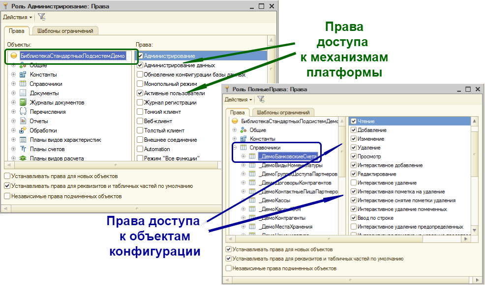Именно с помощью ролей можно добиться приемлемого результата в части разграничений доступа, но не всегда. Если стандартных возможностей этого объекта недостаточно, то в дело вступают различные дополнительные функции, которые добавляют сами разработчики: регистры дополнительных прав, различные запреты с помощью подписок на события и многое, многое другое.