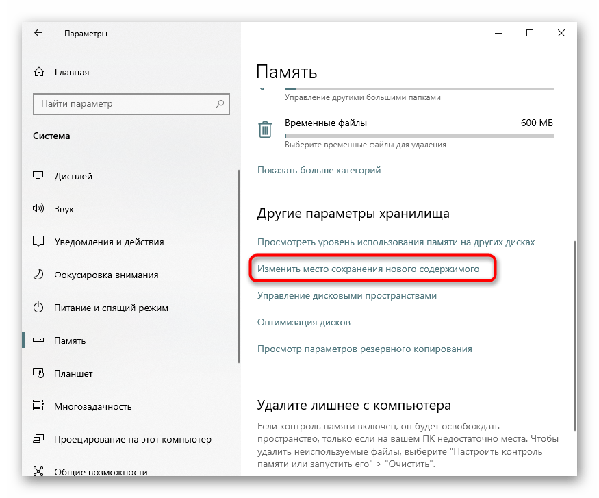Найдите кликабельную ссылку «Изменить место сохранения нового содержимого».