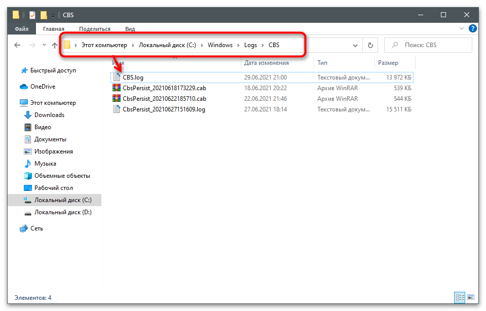 - Запустите «Проводник», перейдите по пути и найдите там файл «CBS.log». Если речь идет о Windows 7, этот объект будет называться «CheckSUR.log». Дважды кликните по нему левой кнопкой мыши для запуска.