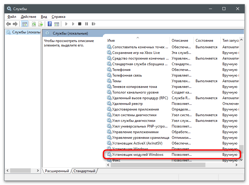 Служба установщика модулей Windows отвечает за корректный запуск и функционирование рассматриваемых в этой статье компонентов. Если она сейчас остановлена, вполне возможно, что у вас не получится попасть в интересующее меню. Для исправления ситуации выполните следующие действия: