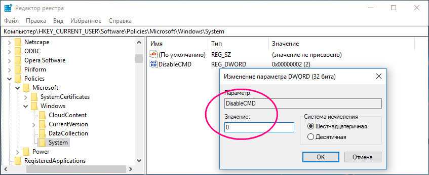 В правой части окошка вы увидите параметр DisableCMD со значением 2. Кликните по нему два раза и установите в качестве нового значения .