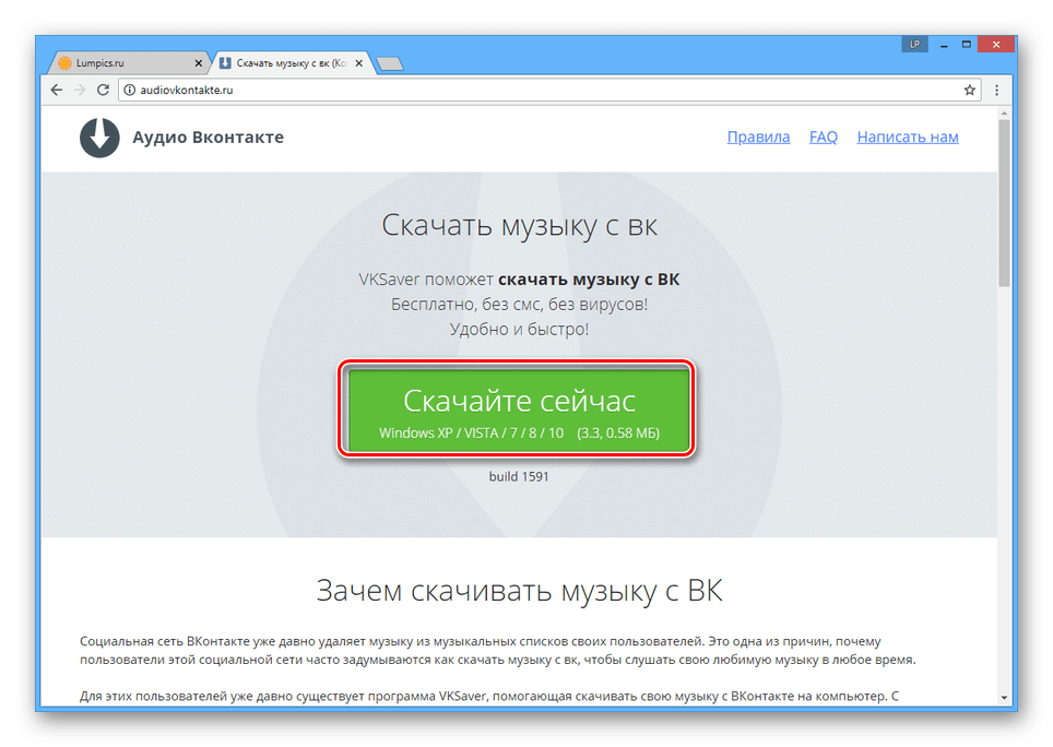 KSaver прошла успешно, и никаких проблем с этим не возникло. Далее нужно перезапустить ваш интернет-браузер (вы же устанавливали программу с закрытым браузером, правда ведь?) и зайти на сайт под вашим логином и паролем. Зайдите на страничку, с которой вам нужно скачать видео или музыкальный файл. Пусть это будет музыка: