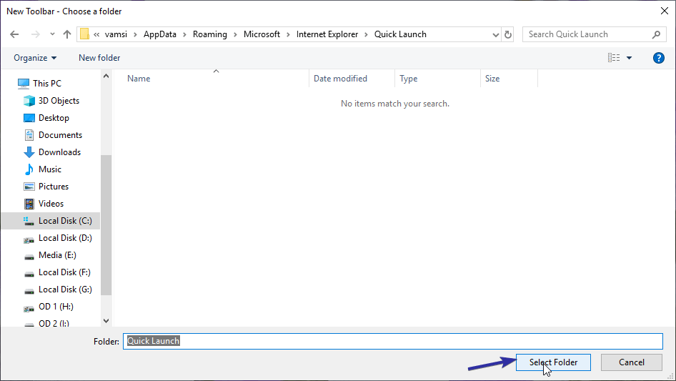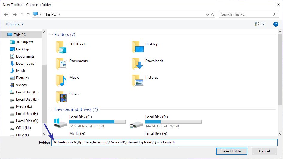 2. As soon as you click on the New Toolbar option, Windows open the folder selection window. Here, enter the following path in the Folder field and press Enter. Since we are using the environment variable, you don’t have to manually use your username in the folder path.